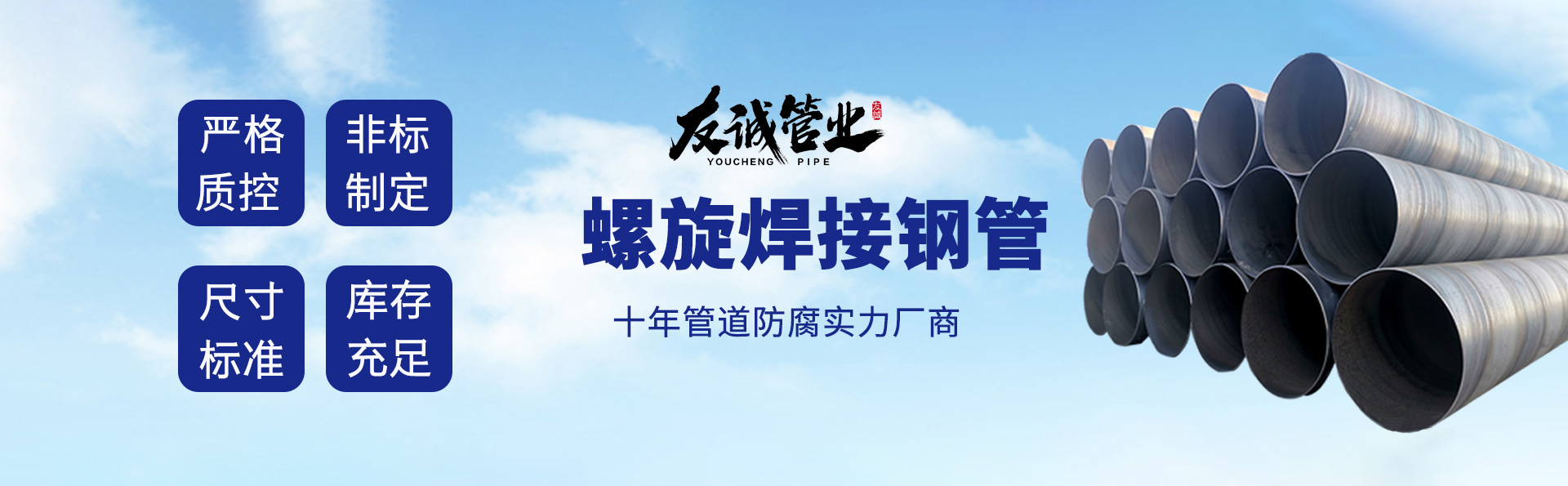 滄州友誠管業(yè)有限公司是一家專業(yè)從事生產(chǎn)防腐涂塑管道及管件于一體的大型企業(yè)。公司注冊(cè)資金8600萬元,位于中國管道生產(chǎn)基地—河北鹽山縣,近靠京滬高速、榮烏高速、黃石高速30公里,高鐵滄州西站40公里,天津國際機(jī)場(chǎng)、濟(jì)南遙墻機(jī)場(chǎng)150公里,為客戶來訪及業(yè)務(wù)發(fā)展提供了便利的交通條件。 鋼管系列:螺旋鋼管、無縫鋼管、ERW直縫焊管、JCOE埋弧焊直縫鋼管、熱鍍鋅鋼管。 涂塑系列:內(nèi)外涂塑鋼管、涂塑復(fù)合鋼…… 了解更多